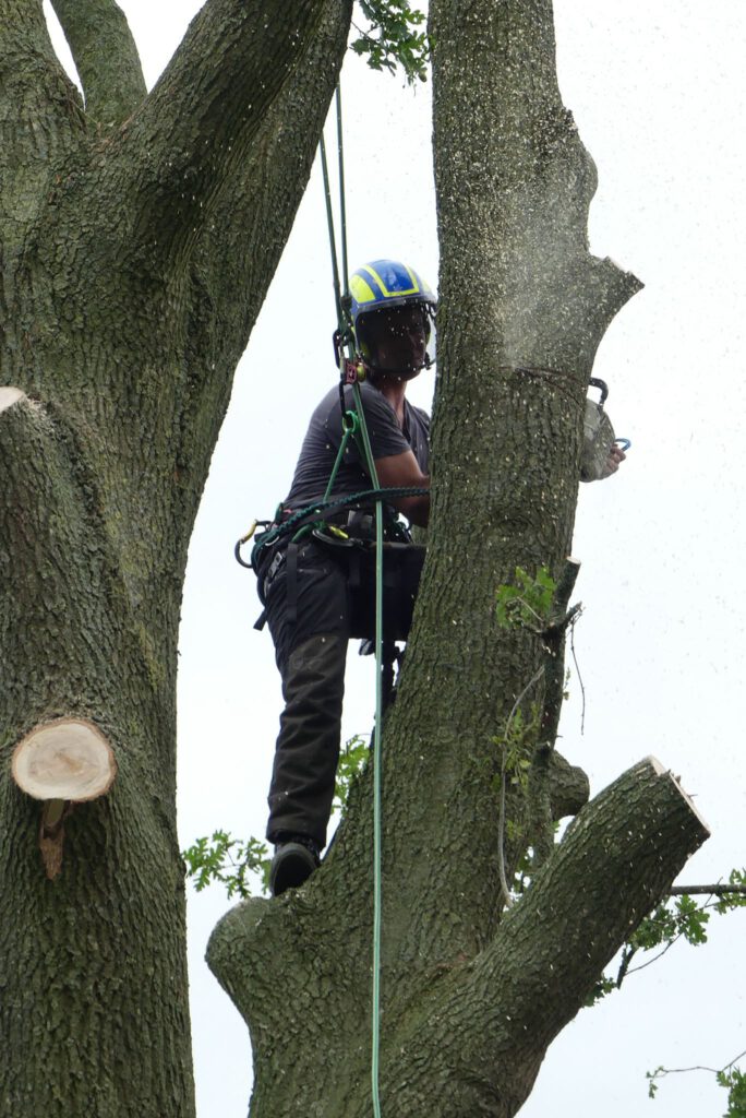 Voordat een boom verwijderd wordt, is het belangrijk om de situatie goed te beoordelen. Is er voldoende ruimte om de boom in één keer te vellen? In een open gebied, zoals een grote tuin of weiland, is dat vaak mogelijk. In stedelijke gebieden of kleine tuinen is dit meestal niet haalbaar. Daar wordt de boom gecontroleerd in delen verwijderd. Dit gebeurt vaak met behulp van klimtechnieken. De boomverzorger klimt in de boom en zaagt takken en stamstukken stukje voor stukje af. Wanneer takken niet vrij kunnen vallen, bijvoorbeeld door nabijgelegen gebouwen, schuttingen of andere bomen, worden ze met speciale lijnen afgevangen. Zo worden ze gecontroleerd naar de grond begeleid, zodat er geen schade ontstaat aan de omgeving.